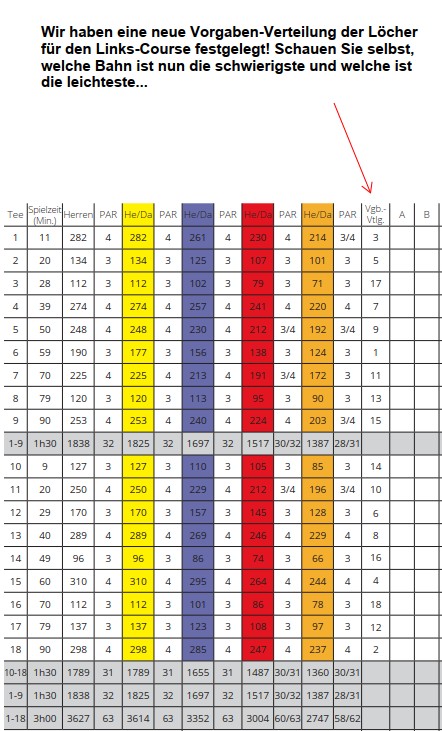 Wir haben die Schwierigkeitseinstufung (Handicap‑Index) unserer einzelnen Löcher auf dem Links Course überarbeitet. Bitte beachten Sie, dass ab sofort die neue Verteilung gültig ist.